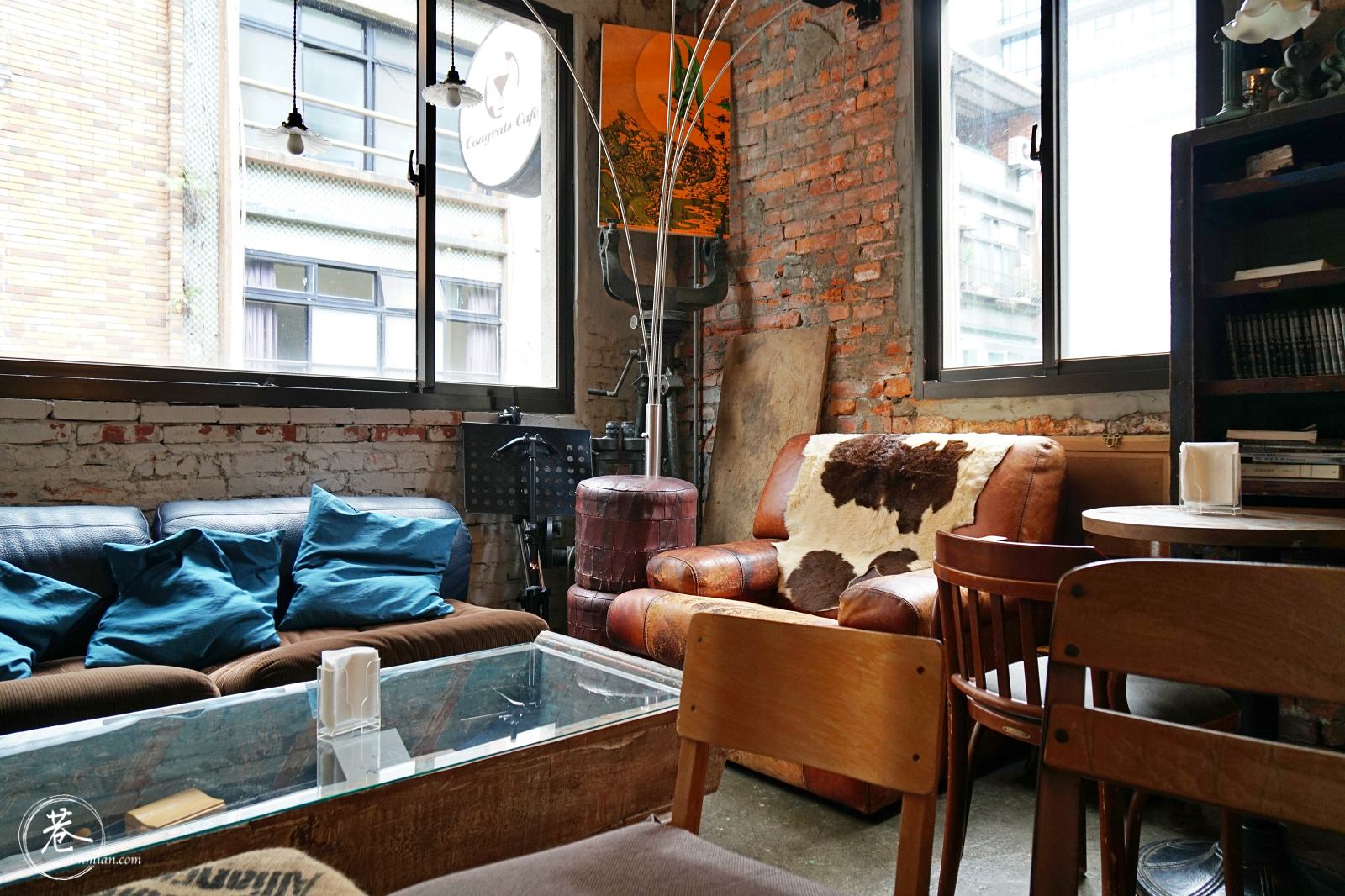 Congrats Cafe 位在捷運信義安和站二號出口不遠處,也是大名鼎鼎的文昌傢具街內,推開位在巷子內的木門,走上二樓階梯就是 Congrats Cafe,長方形的室內擺滿了各種非常有味道的傢俱,深紅色皮質的沙發椅、很有異國風情的花不椅、皮草沙發靠墊、靛藍色的沙發,整個空間超有個性。
