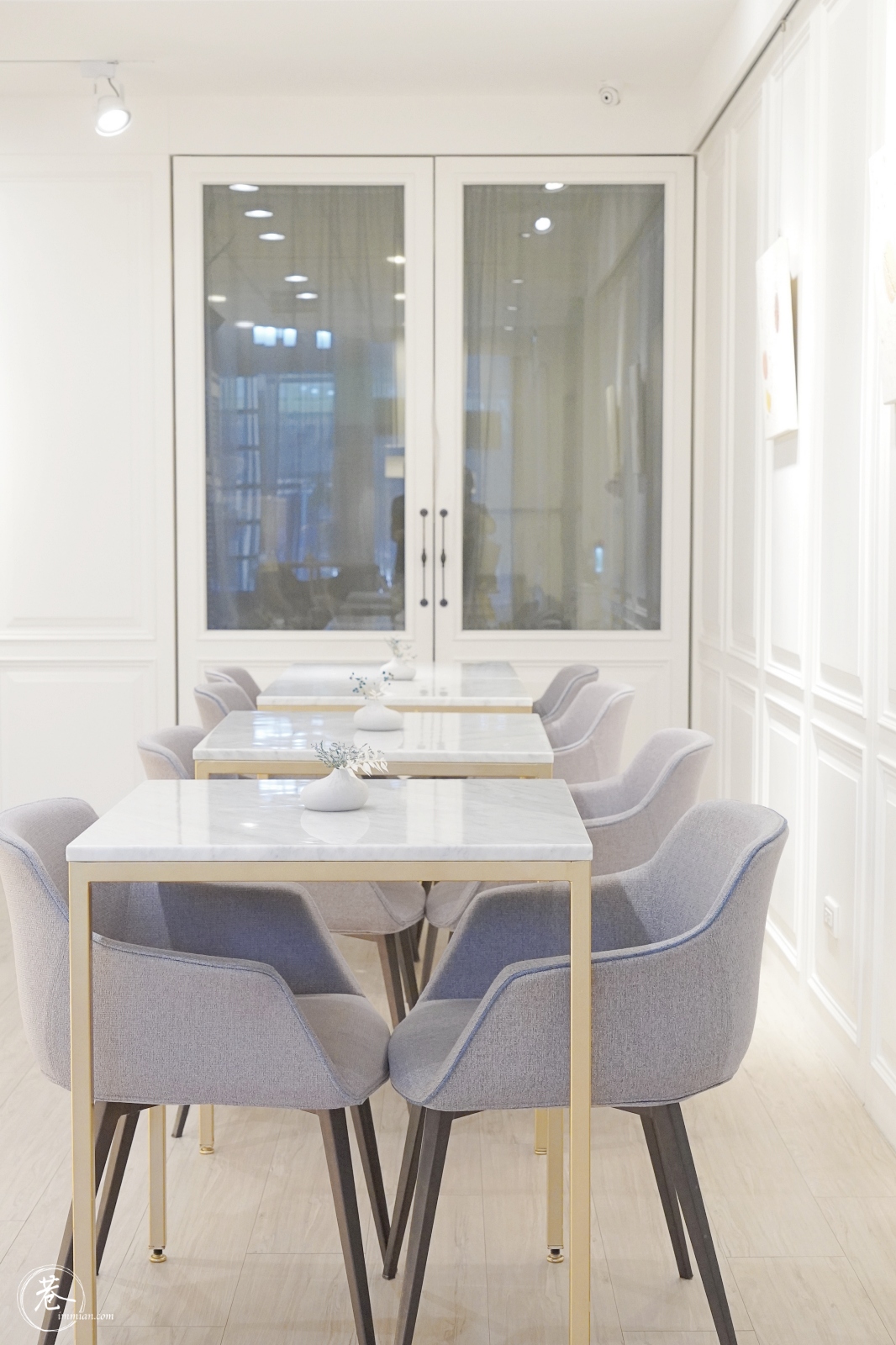 芙芙法式甜點店位在內湖港墘站附近的商辦二樓,一樓是第一銀行,搭電梯上二樓之後整個氣氛轉換,白色大理石紋的空間,搭配粉金色調、很有質感的裝飾,瞬間以為自己走進美術館。
