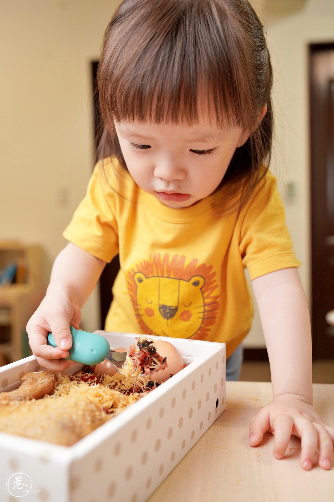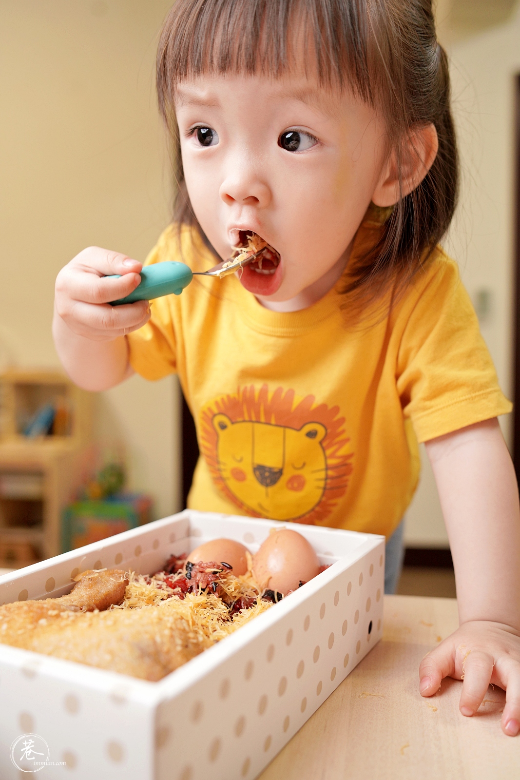 ▼覺得紅麴油飯超好吃的寶寶,大方分享給拍照的爸爸媽媽吃,自己小時候沒能吃到自己的油飯,現在吃也可以XD