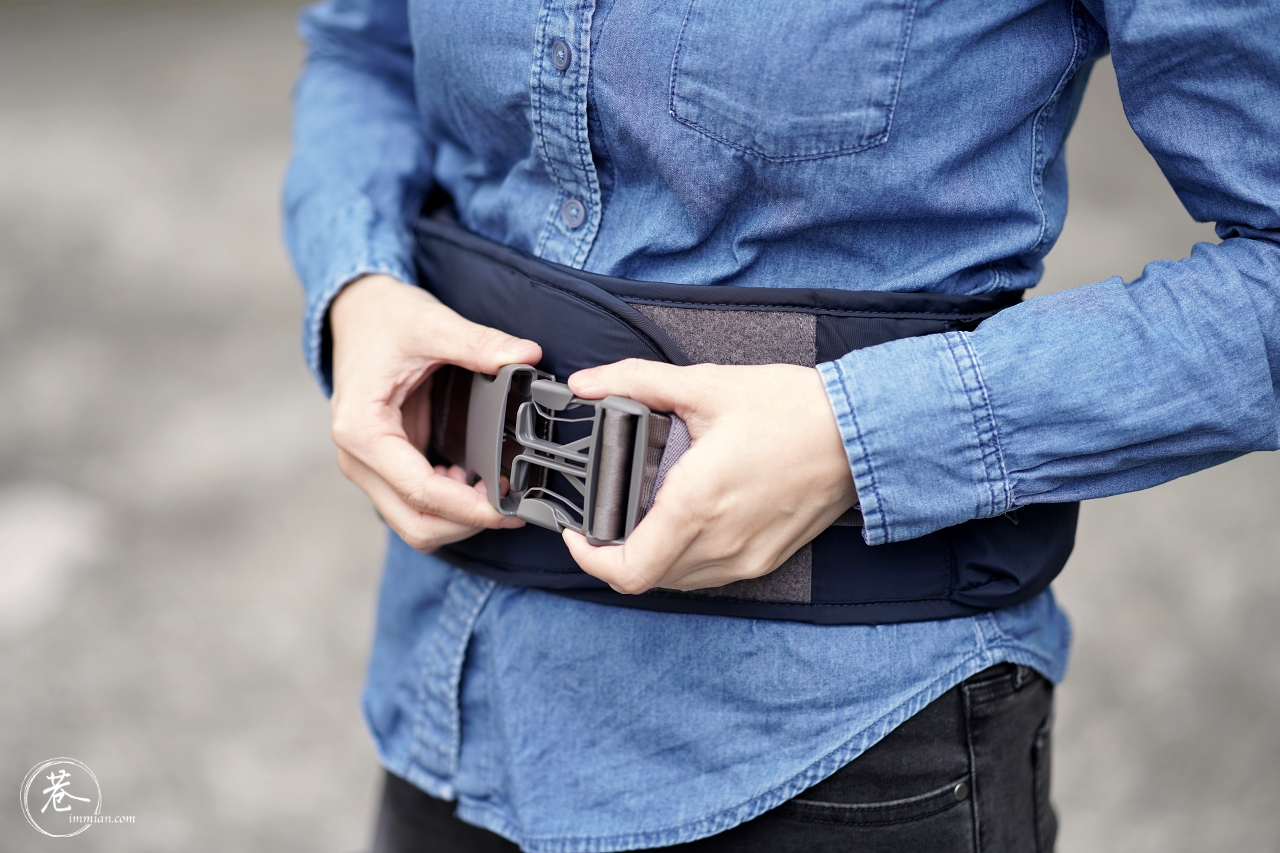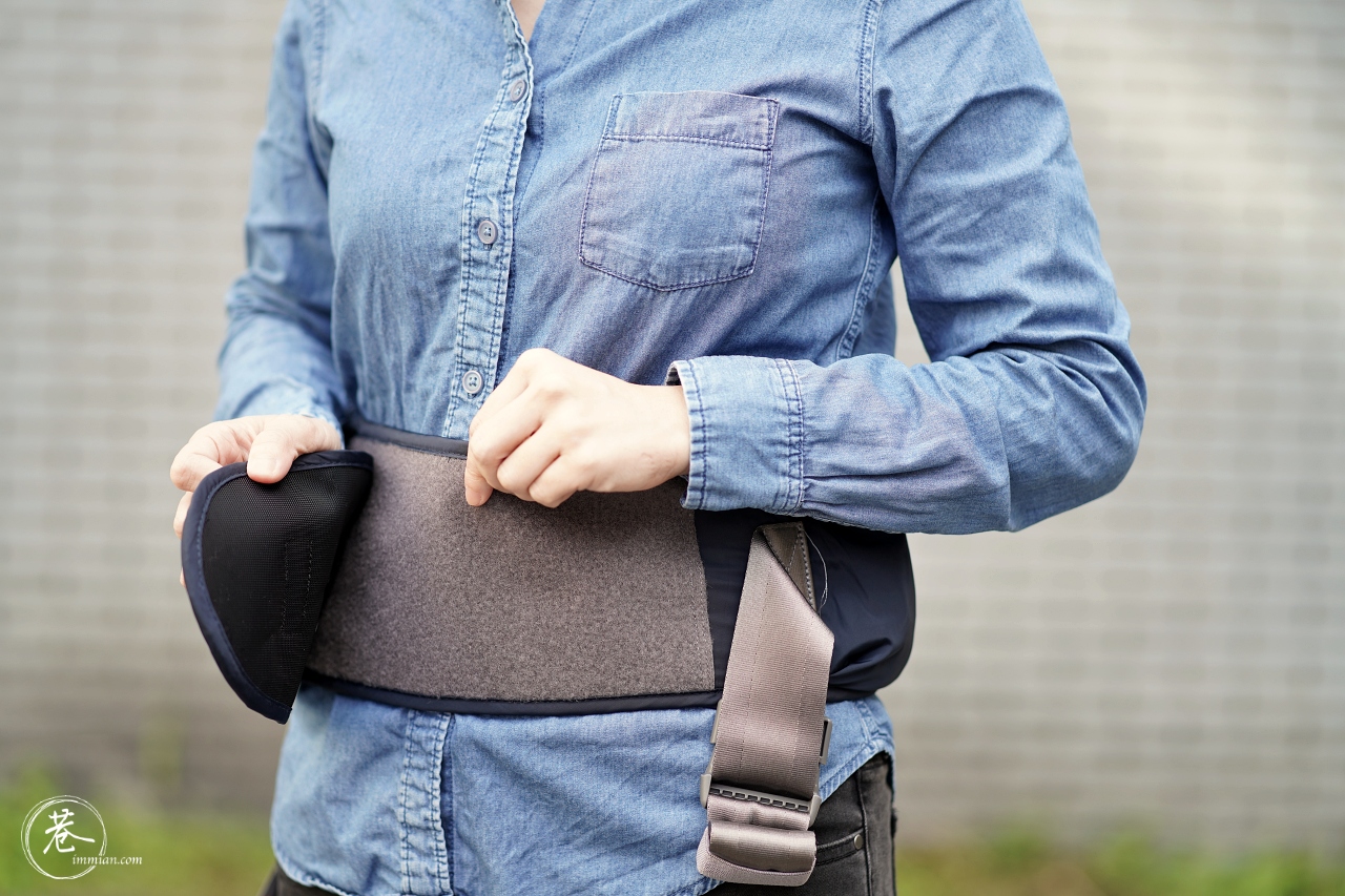 為了雙重固定,腰帶的部分除了魔鬼氈之外,還有扣環可以固定,使用起來比較安全。從下面這兩張圖也可以看出來腰帶有加寬,穿上去之後有種固定、護腰的感覺,以我的寶寶目前 6.5 公斤來說背起來還滿輕鬆的。