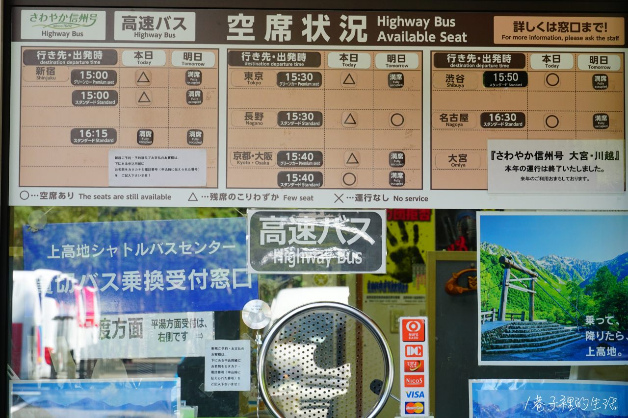 如果不是要回松本,而是要直接從上高地搭往新宿、涉谷、東京、名古屋、大阪的話,要上網先預約巴士喔!