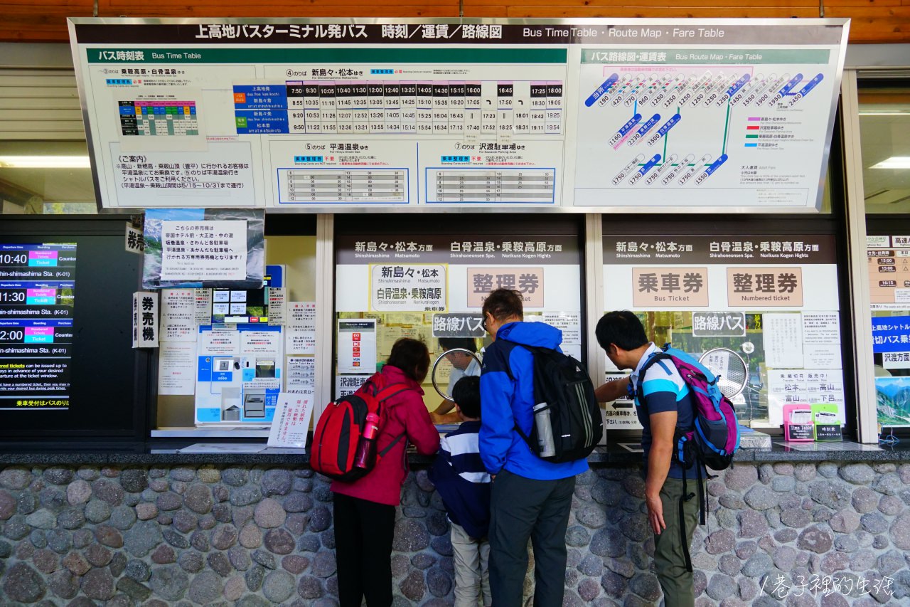 如果和我們一樣是從大正池走到巴士終點站的話,記得第一件事就是去抽巴士乘車號碼牌(乘車整理券),乘車號碼牌就在遊客中心和巴士停車場中間連接的那一側,只要跟服務人員說想要搭車的時間他就會給你號碼牌,記得幾個人搭車就要拿幾張號碼牌,屆時下山時搭車會是依照號碼牌叫號的。除了直接開到松本車站的那班巴士有限制人數之外,開到新島島的巴士如果抽號碼牌的人太多就會加開疏運巴士。
