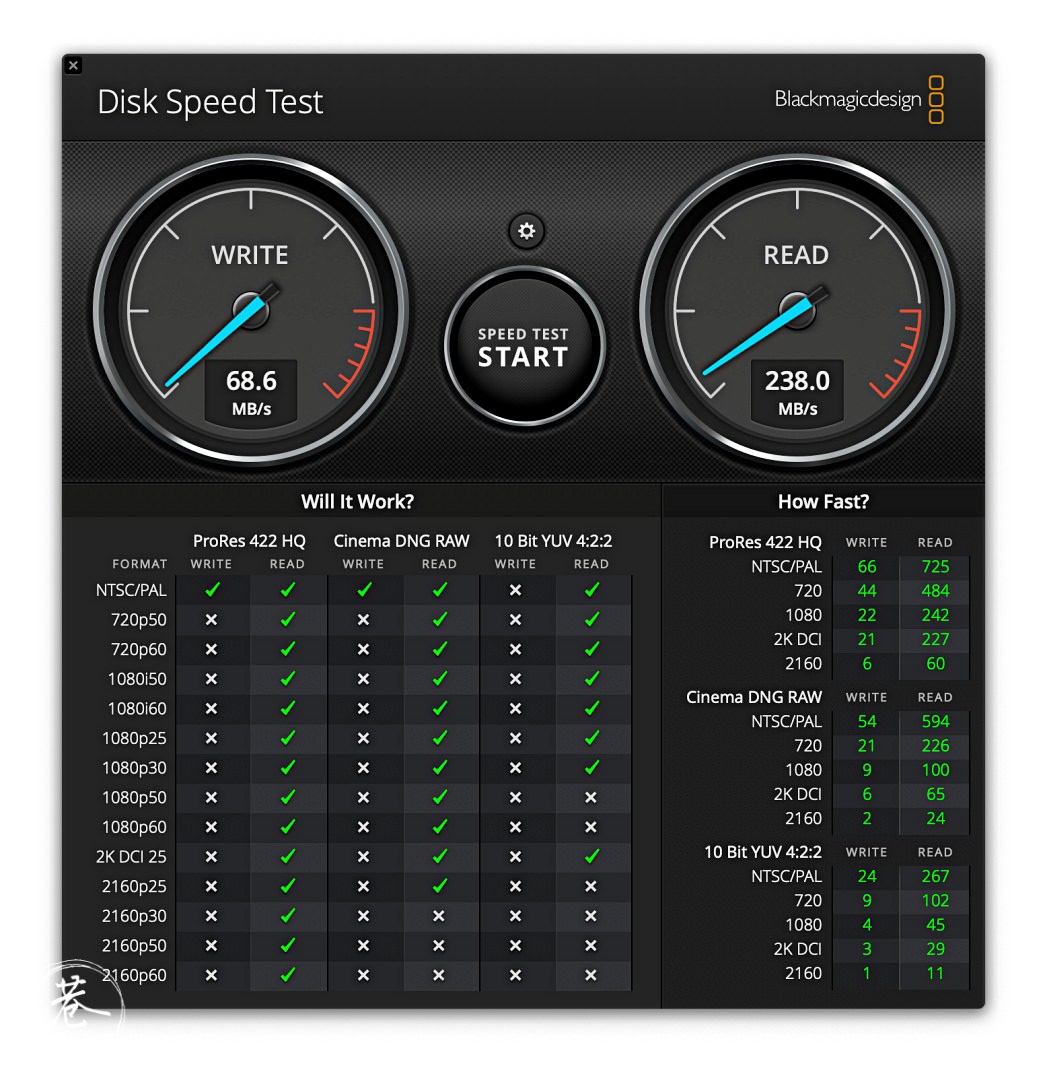實際透過「AJA System Test Lite」和「Blackmagic Disk Speed Test」測試 Lexar 1667x 速度跑出像下圖一樣的成績,就像官網說得一樣讀寫差不多是 250MB/s 到 90 MB/s 的表現。