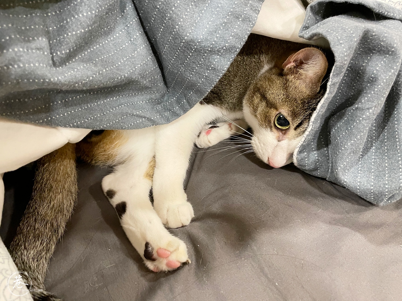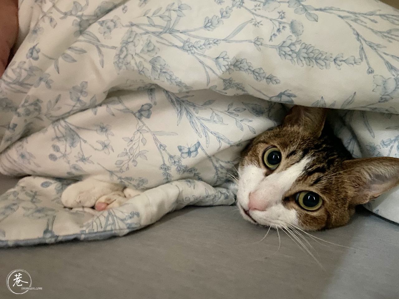 喵喵怕冷又怕熱,夏天的時候會趴在涼涼的大理石平台上,冬天的時候會很可愛的鑽我們棉被跟我們一起睡,鑽棉被的方式也很可愛,會站在我們頭旁邊往棉被看,要我們打開一個洞讓他進來,最喜歡窩在我們胯下或腿邊,一隻喵溫暖的把身體伸得長長的,把我們的雙人床硬是變成單人床,讓我們睡的腰痠背痛。
