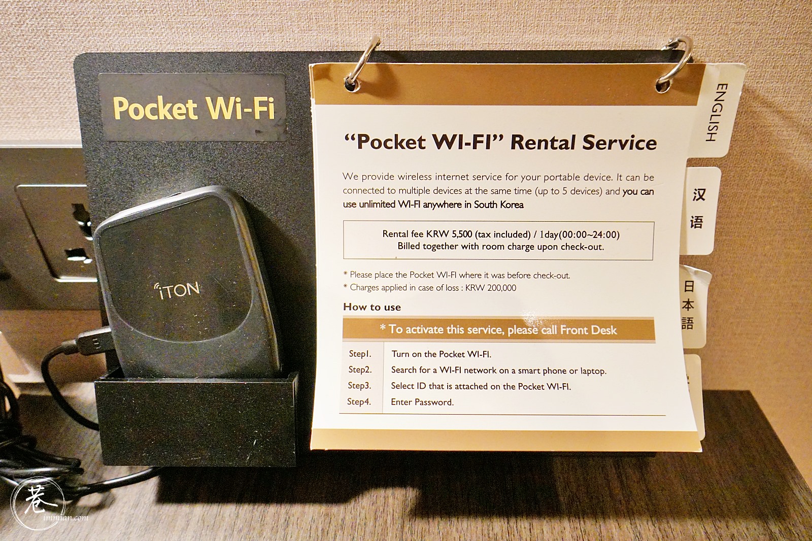 ▼明洞九樹二號飯店還有提供 Wi-Fi 機租借的服務,Wi-Fi 機就放在桌上,租借一天 5,500 韓元,大約是 150 元台幣左右。