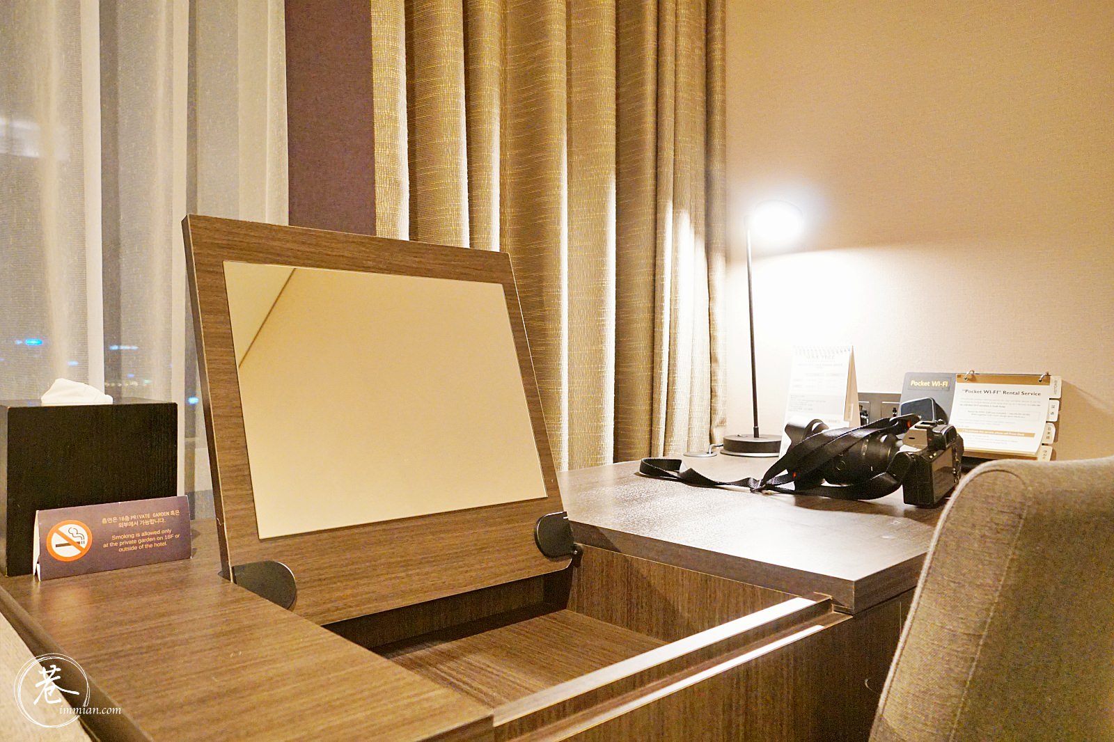 ▼靠窗的地方有個化妝桌,桌面掀起來下方就是鏡子,旁邊牆上則有萬國插座。房間內的插座有些是萬國插座,有些是韓國的兩圓腳插座,來住的話記得帶轉接頭。
