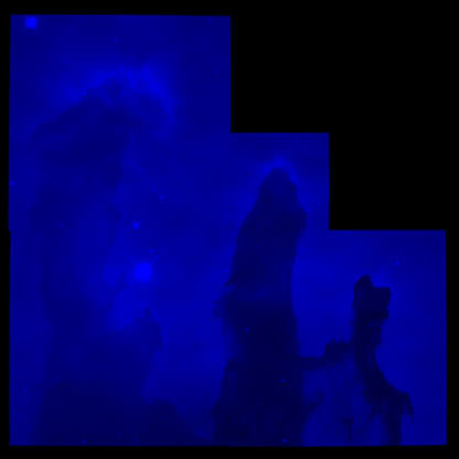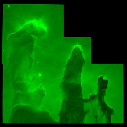 利用類似的方式再處理完氫原子濾鏡以及硫離子濾鏡後,接下來將為三個濾鏡所拍攝到的影像上色。把雙電離氧原子濾鏡的照片設為藍色,氫原子濾鏡設為綠色,硫離子濾鏡設為紅色,結合在一起後就成了最終我們看到的「創生之柱」的照片。