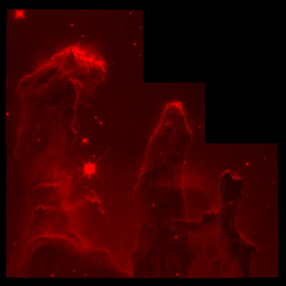 將 32 張照片都經過類似的處理之後,就可以拼接出創生之柱的照片原型,照片右上角之所以沒有影像是因為 WFPC 2 的其中一顆鏡頭倍率較高、視野較小,天文學家為了能看見更清楚的細節,所以將這個鏡頭所得到的影像依照比例縮小,讓它可以和其他三顆鏡頭拍出來的影像組合再一起。