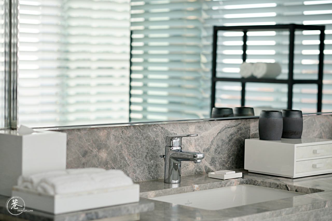 沐浴空間的設計應該是我近年來住過最好的沐浴空間了,以黑色大理石作為主色調,搭配白色的浴缸以及沐浴用品,整個設計營造出低調奢華的感覺,有獨立的淋浴間和獨立的廁所,因此可以邊放浴缸水邊淋浴,洗完澡剛好出來泡澡。