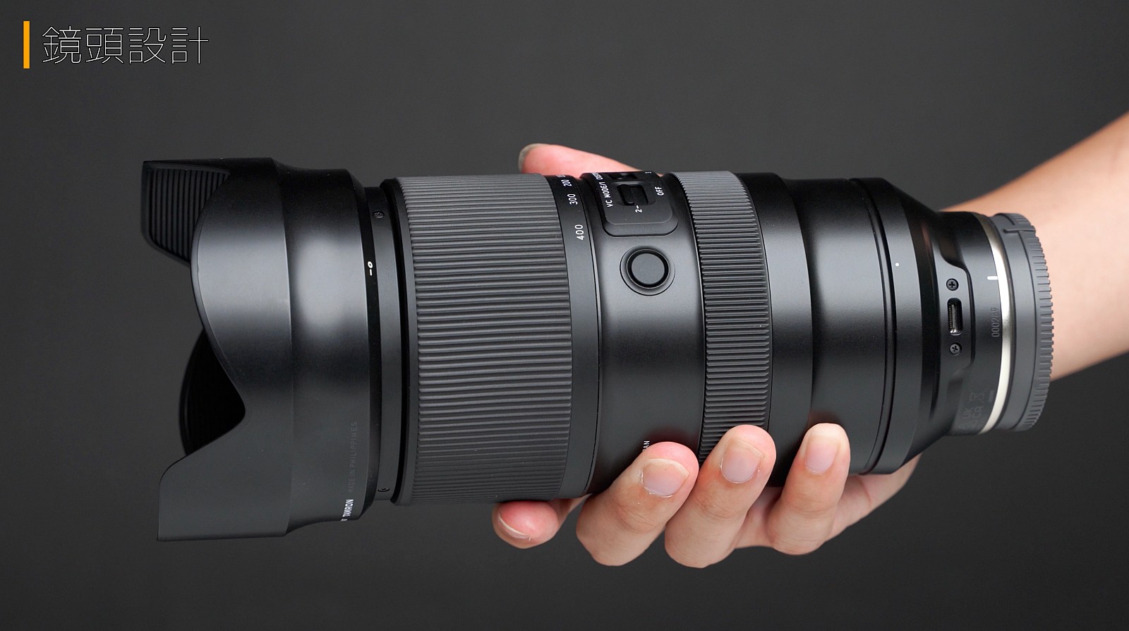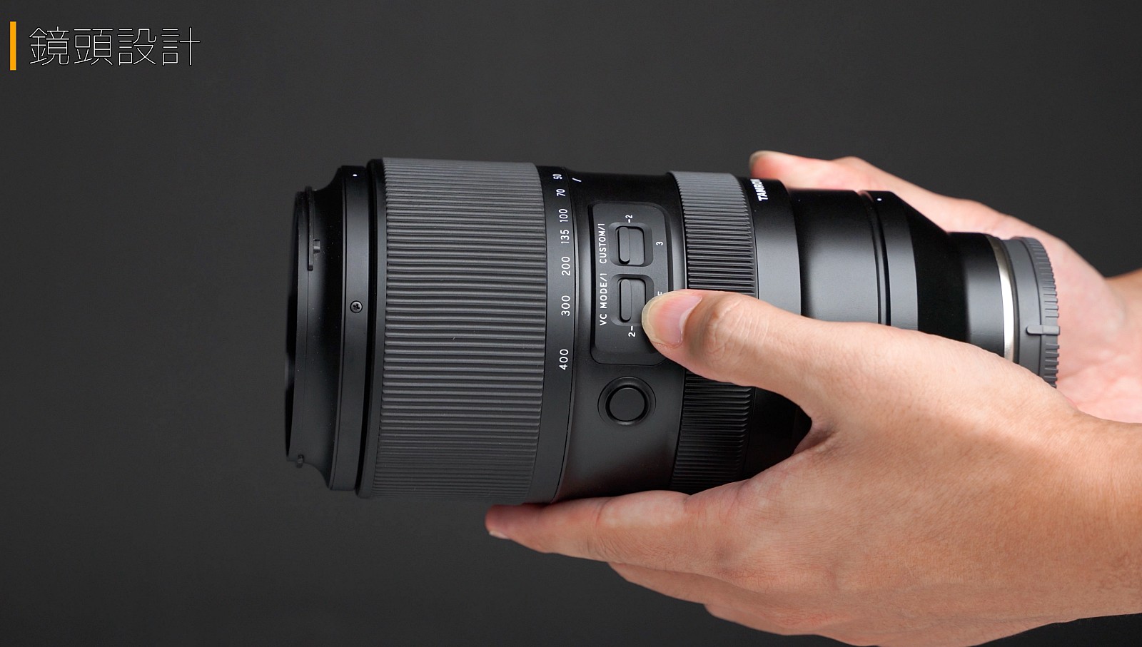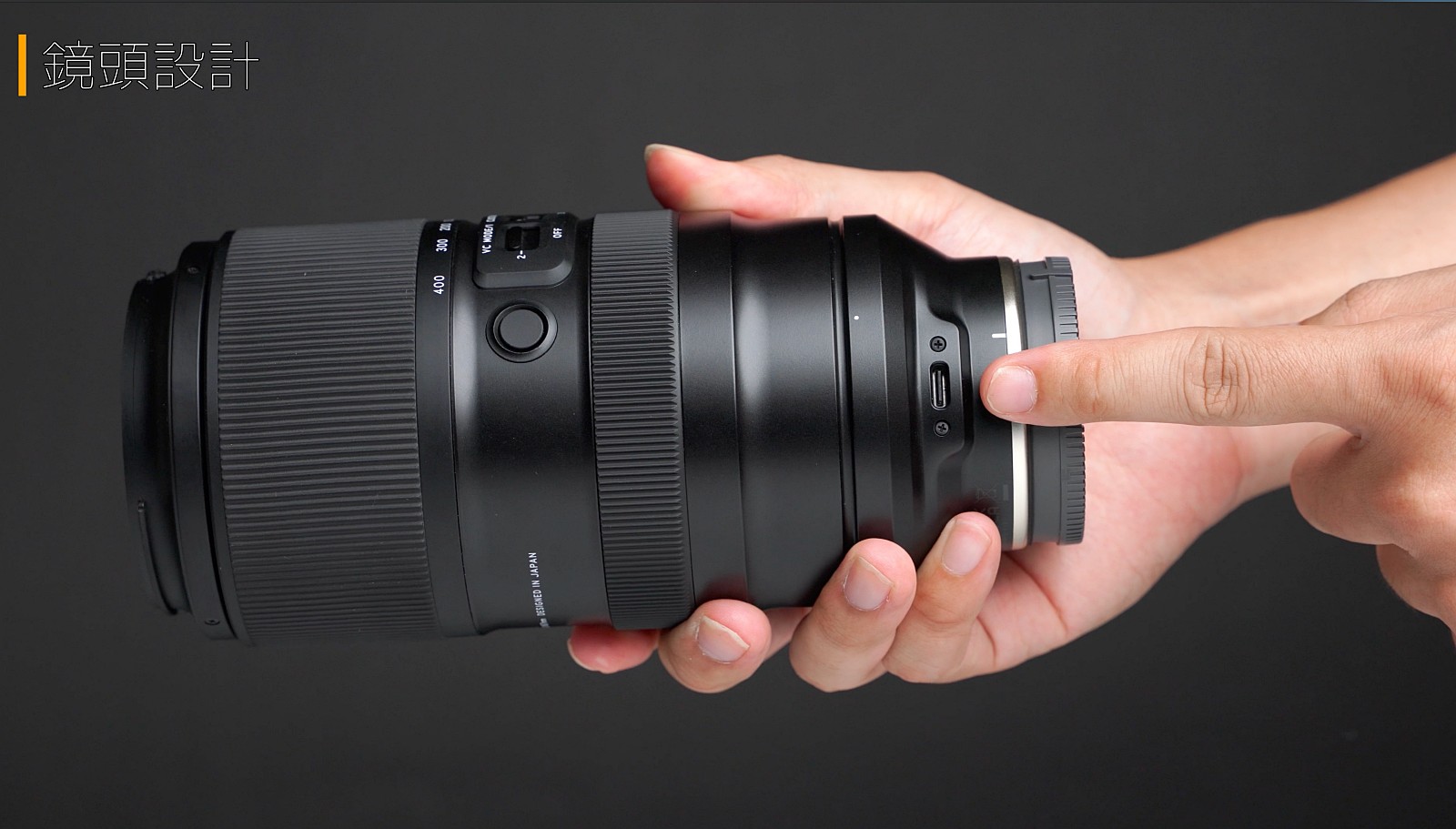 Tamron 50-400mm 採用了 Tamron 二代鏡的的設計語言,從 Tamron 35-150mm、28-75mm F2.8 G2 之後都是這樣的方向。鏡頭操作鈕,除了圓形的對焦固定鈕之外,還有個防手震模式 VC Mode 切換、與自訂開關,鏡頭接近底部有個 USB-C 連接埠,可以讓你連接電腦使用 Tamron Lens Utility 來自定鏡頭功能,另外一側有個變焦鎖,可以幫你固定鏡頭。