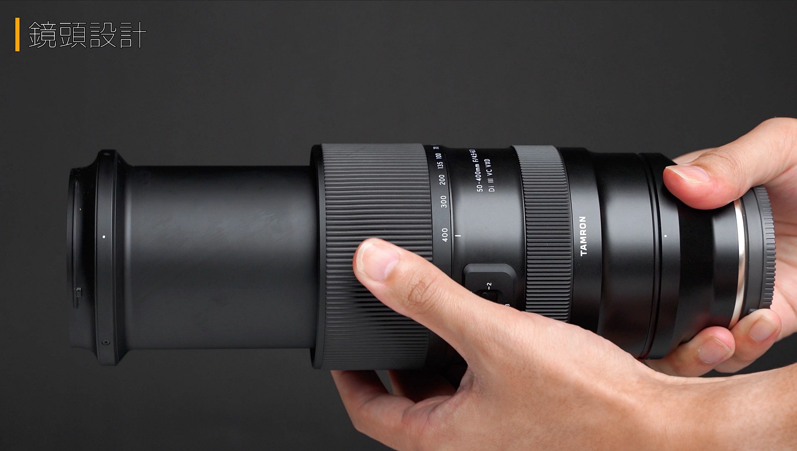 這顆鏡頭有四個特色我覺得比較特殊,首先是從廣角端 50mm 到望遠端 400mm, 轉的角度大概是 85 度左右,所以你可以比較快速的去操作變焦切換視野;第二是它的口徑僅僅只有 67mm,這應該算是 Tamron 的傳統了(笑),這以超望遠鏡頭來說是相對比較罕見的,不然一般的 400mm 變焦鏡,口徑通常都要到 77 或是 82mm,不過這比較小的口徑,也帶來了一些光學上的取捨,這我們之後會解釋到。