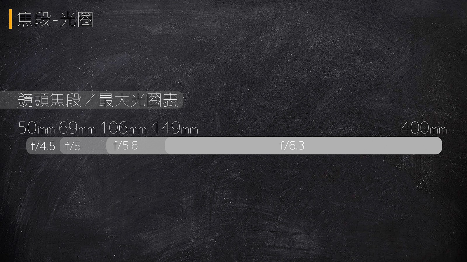在焦段光圈分佈方面,這顆鏡頭在 50-69mm 之間,最大光圈是 f/4.5,在 69-106mm 之間是 f/5,在 106-149mm 則是 f/5.6,從 149mm 之後都是 f/6.3。通常在做運動拍攝的時候,我比較常把光圈固定在 f/6.3 搭配 M 模式,避免因為光圈不同造成的曝光值變化。